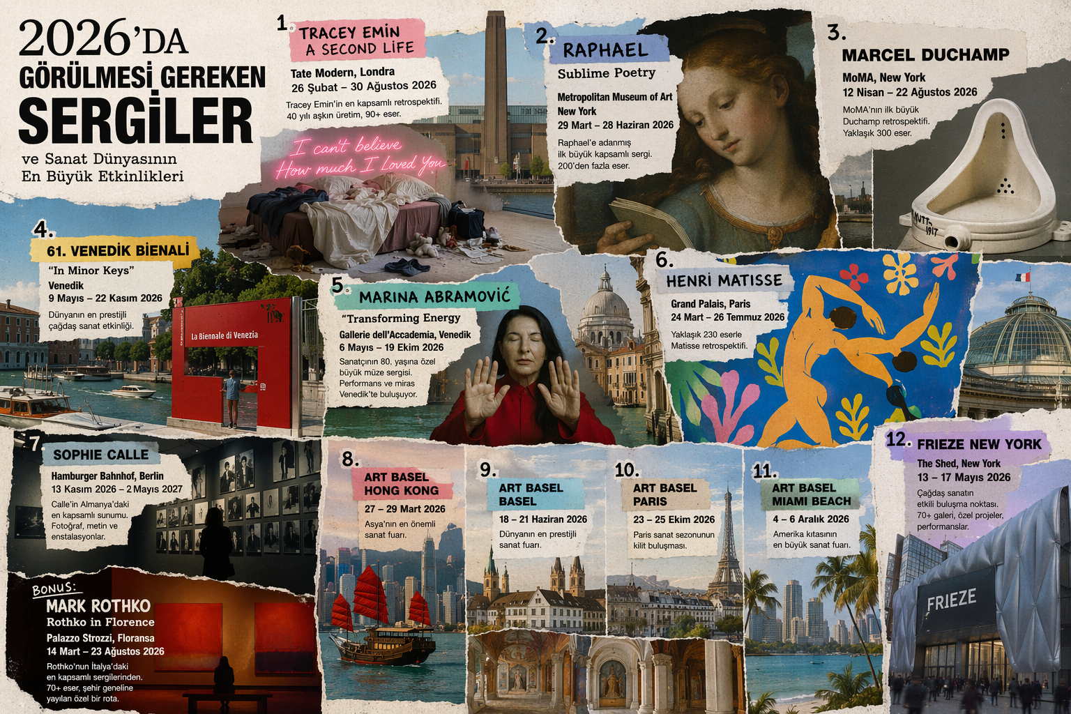 2026, sanat dünyası için müze retrospektiflerinden bienallere uzanan olağanüstü yoğun bir takvim sunuyor. Londra’dan New York’a, Venedik’ten Berlin’e uzanan bu yılın öne çıkan sergi ve etkinlikleri, hem modern sanat tarihinin dev isimlerini hem de çağdaş sanatın yıldızlarını bir araya getiriyor.