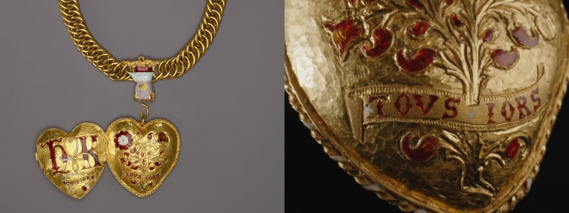 Kolye, 2019 yılında İngiltere’nin Warwickshire bölgesinde bulundu ve 1996 Treasure Act kapsamında yetkililere bildirildi. Ön yüzünde Tudor gülü ve nar dalı, arka yüzünde ise “H” ve “K” harfleri yer alıyor. Her iki yüzde de Eski Fransızcada “daima” anlamına gelen TOVS IORS ifadesi bulunuyor.
