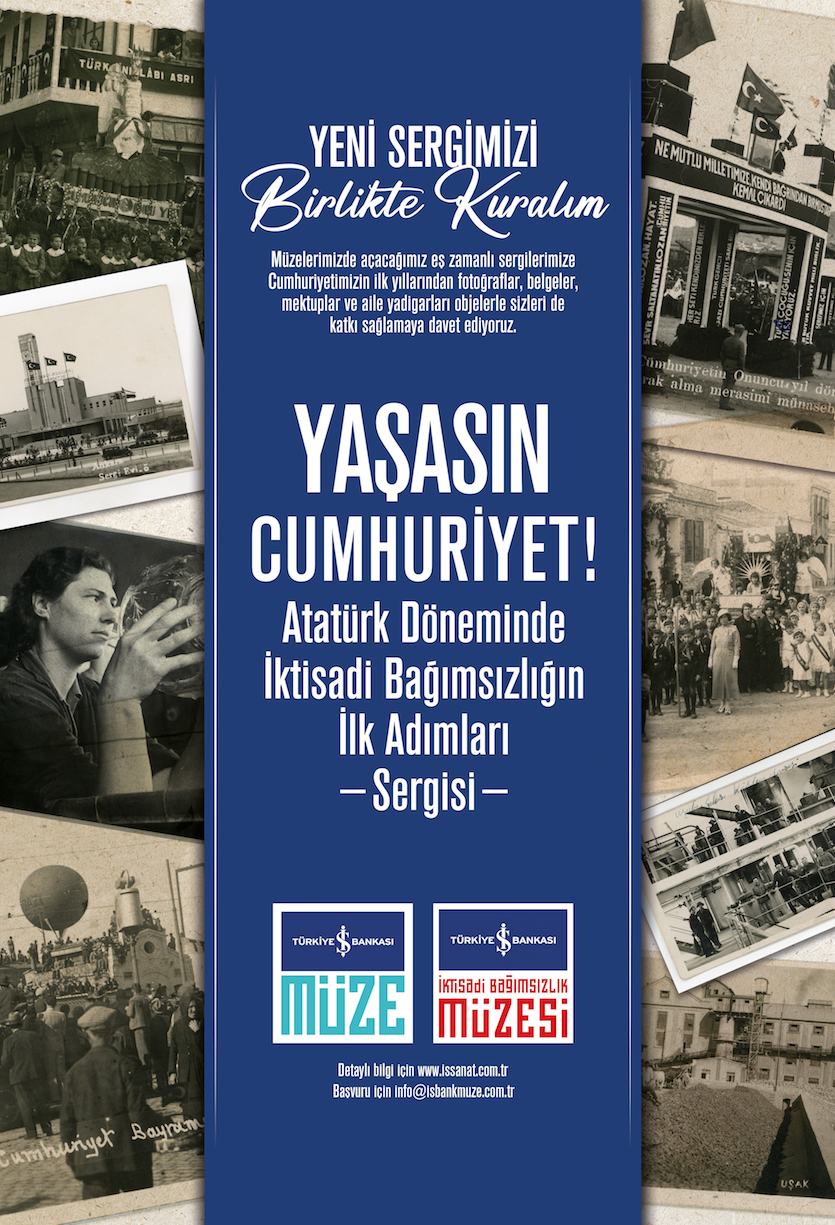 İş Sanat, Cumhuriyetimizin 100. Yılı vesilesiyle İstanbul’da Türkiye İş Bankası Müzesi ile Ankara’da İktisadi Bağımsızlık Müzesi’nde açacağı “Yaşasın Cumhuriyet! Atatürk Döneminde İktisadi Bağımsızlığın İlk Adımları” başlıklı yeni sergisine Cumhuriyet’in kuruluş döneminden kalan aile yadigârlarıyla katkı sağlamak isteyenlere davette bulunuyor.