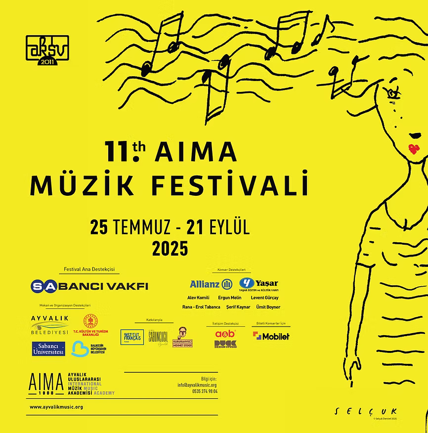 Ayvalık Uluslararası Müzik Akademisi (AIMA), bu yıl 11. kez düzenleyeceği AIMA Müzik Festivali ile 25 Temmuz – 21 Eylül 2025 tarihleri arasında klasik müziğin ustalarını, genç yeteneklerini ve sanatseverleri Ayvalık’ta buluşturuyor.