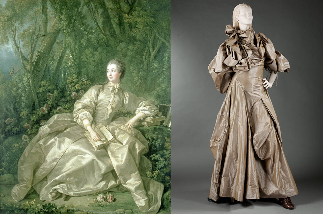 Bu koleksiyon aynı zamanda, Westwood’un, André-Charles Boulle tarafından tasarlanan ve V&A koleksiyonunda yer alan bir mobilyadan ilham alan kadife bir parça da içeriyordu. Westwood 2003’te sanat tarihinden imgelere doğrudan atıfta bulunmaya devam etti ve François Boucher’nin bir tablosundan ilham alarak Madame de Pompadour’un buruşuk ipek elbisesini yeniden yorumladı.