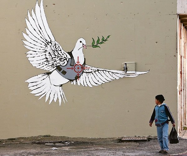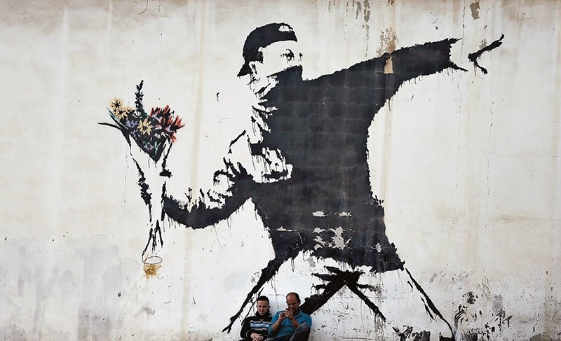 Sevgiyi, umudu da hep işleyen Banksy’nin eserlerinde birçok şey net olsa da birçok da detay saklıdır. Örneğin ‘Love is in the air’ adlı eser… ‘Çiçek atıcı’ olarak da bilinen ‘Love is in the air’ ilk olarak 2003 yılında Batı Şeria Duvarı’nın inşasından kısa bir süre sonra Beytüllahim’de ortaya çıktı. Filistin’i, İsrail’den ayıran 760 kilometrelik duvara yapılmıştı. Banksy’nin eserindeki figür, militan gibi giyinmiş, beyzbol şapkası ve yüzünün alt yarısını maskelemek için bandana takan, bir el bombası veya molotof kokteyli atan genç bir adamdır. Ancak sanatçı adamın eline bomba yerine bir demet çiçek vermiştir. Duruşundaki öfkeye rağmen genç adam evrensel bir barış sembolü fırlatmaya hazırlanıyordur. Filistin’i dünyanın en büyük açık hapishanesine çeviren duvar, Banksy’nin işinden sonra resimler ve protesto yazılarının yazıldığı bir tuval haline geldi.