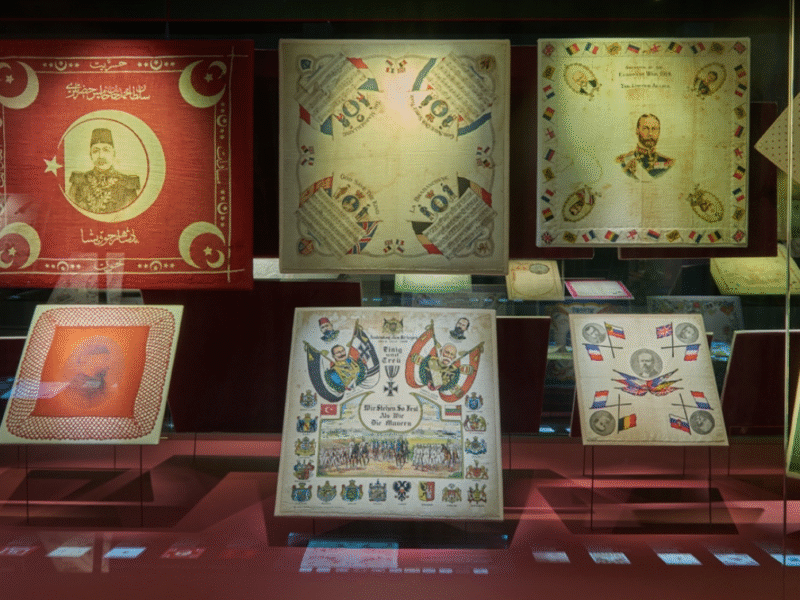 Hatıra mendilleri, Kırım Savaşı’ndan İkinci Dünya Savaşı’na uzanan dönemin önemli olaylarını, bu olayların geçtiği mekânları ve tanıklarını konu ediyor. Sanayileşme, ulus-devletler, savaşlar, hükümdarların tahta çıkışları, büyük hanedanların çöküşleri gibi tarihsel olayların tanığı olan, hatta bu olayların propaganda faaliyetlerinde de kullanılan bu mendiller, adeta yaşayan özgün birer belge gibi ziyaretçilere sunuluyor.