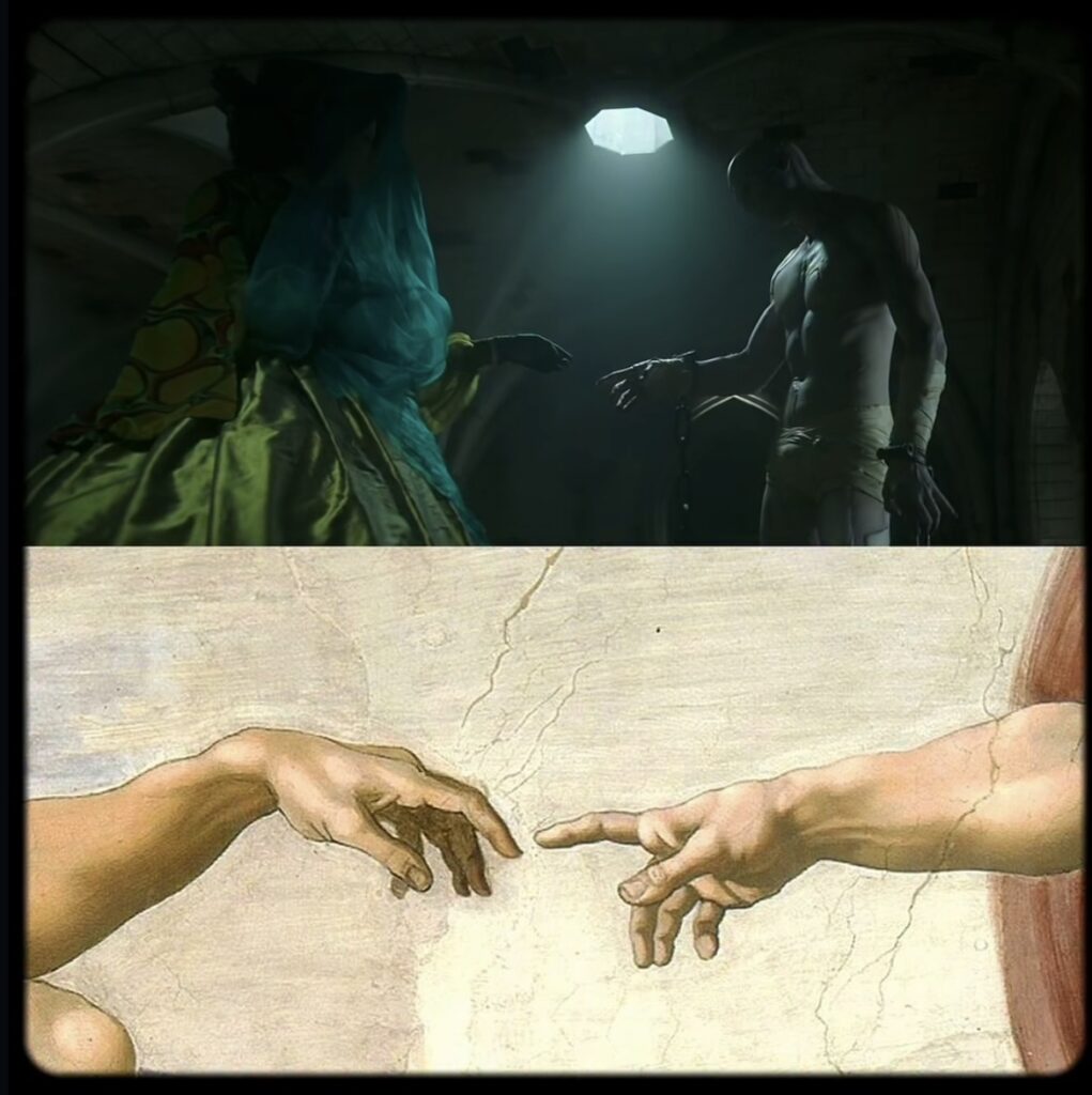 Üstte: Frankenstein (2025) / Altta: The Creation of Adam, Michelangelo (1512)