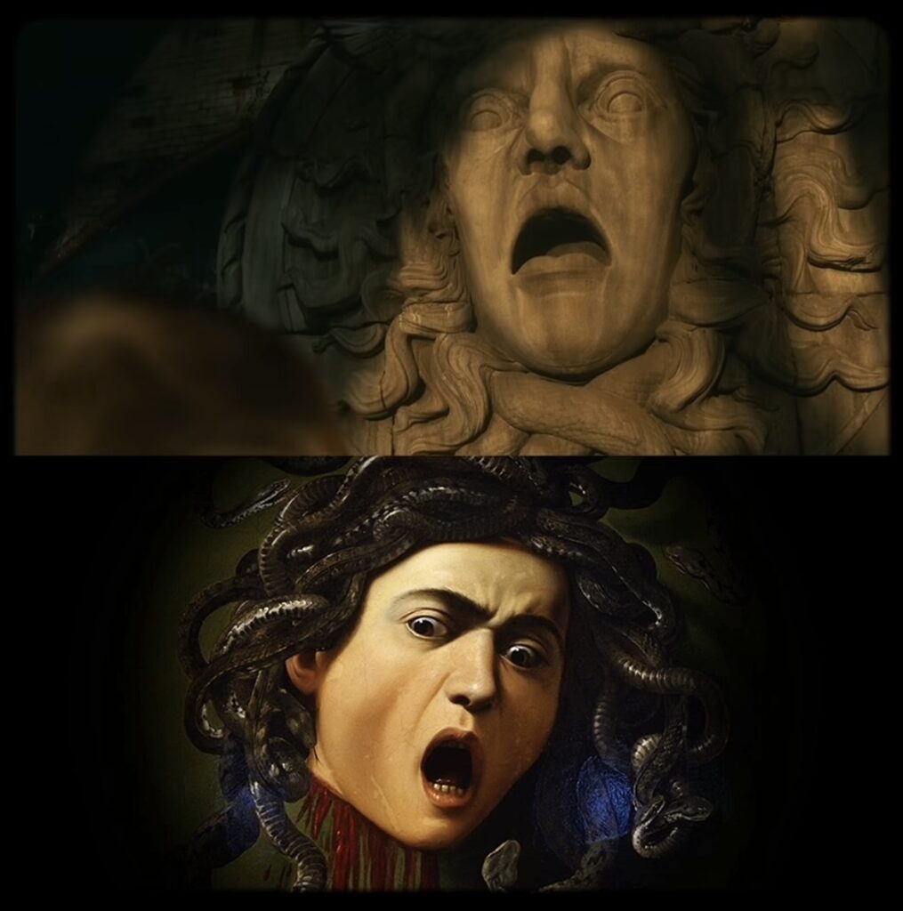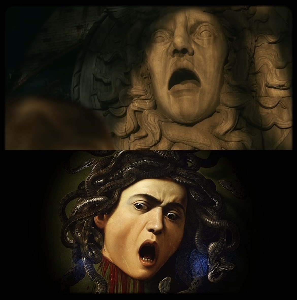 Üstte: Frankenstein (2025) / Altta: Medusa, Caravaggio (1597)